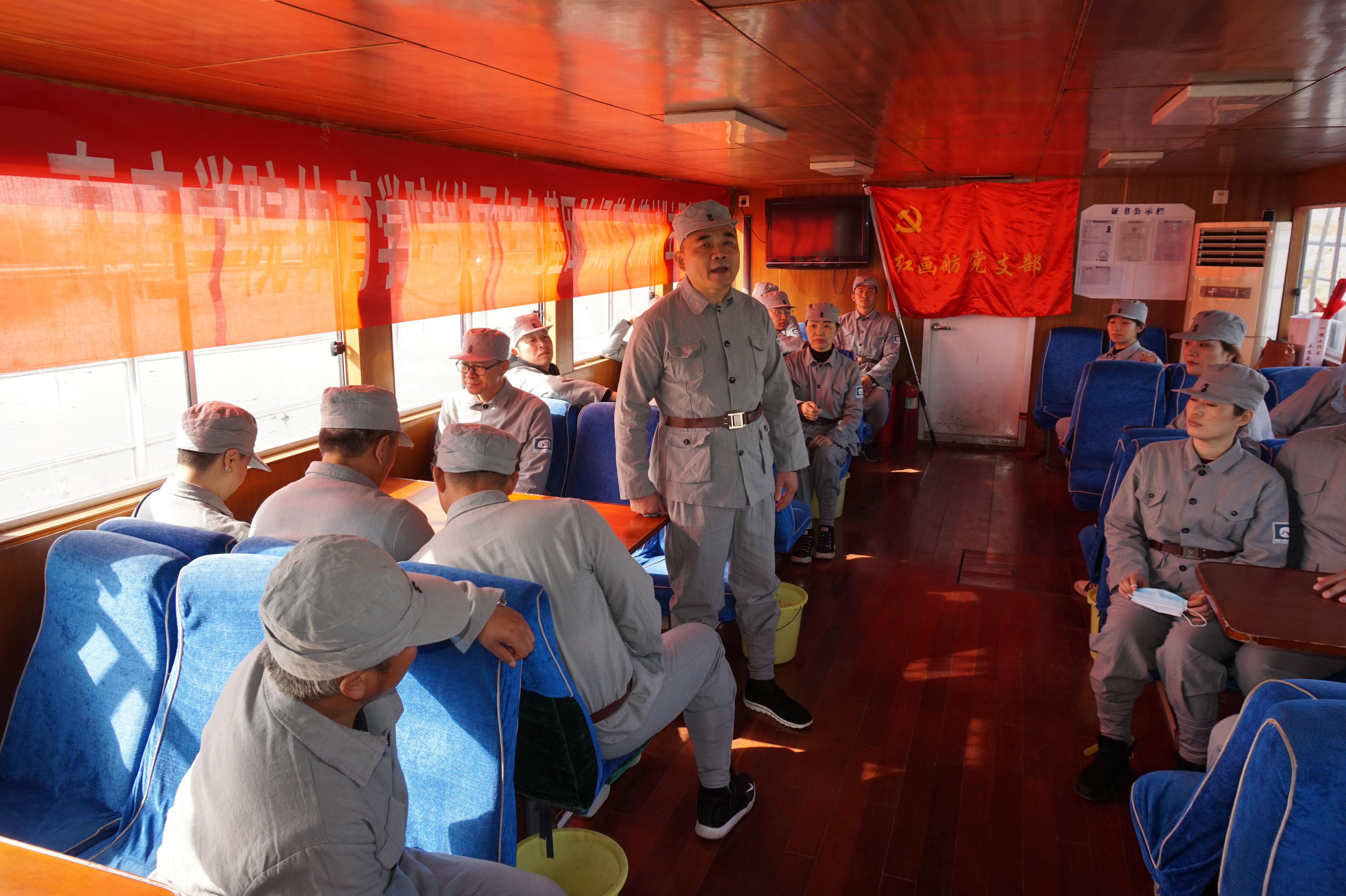 在去“红岛”的轮渡船上,院党总支书记孟祥卫现场讲党课,讲述了中共“一大”在浙江嘉兴南湖游船上胜利闭幕历史事件,并对“红船精神”的深刻内涵进行了诠释
