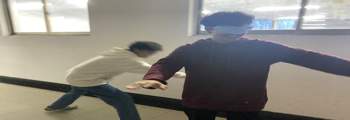 首先,同学们在熟悉的环境内,一名同学蒙住双眼,其余同学通过踩地板发出声音来让蒙住眼的同学找人,蒙住眼睛的同学通过听觉心里的感觉,来判断其余同学的位置,进行“寻人“在同学们熟悉规则之后,从心理上抹除了蒙眼的恐惧感,增加了个人感知能力而且增强了同学们心理承受能力。