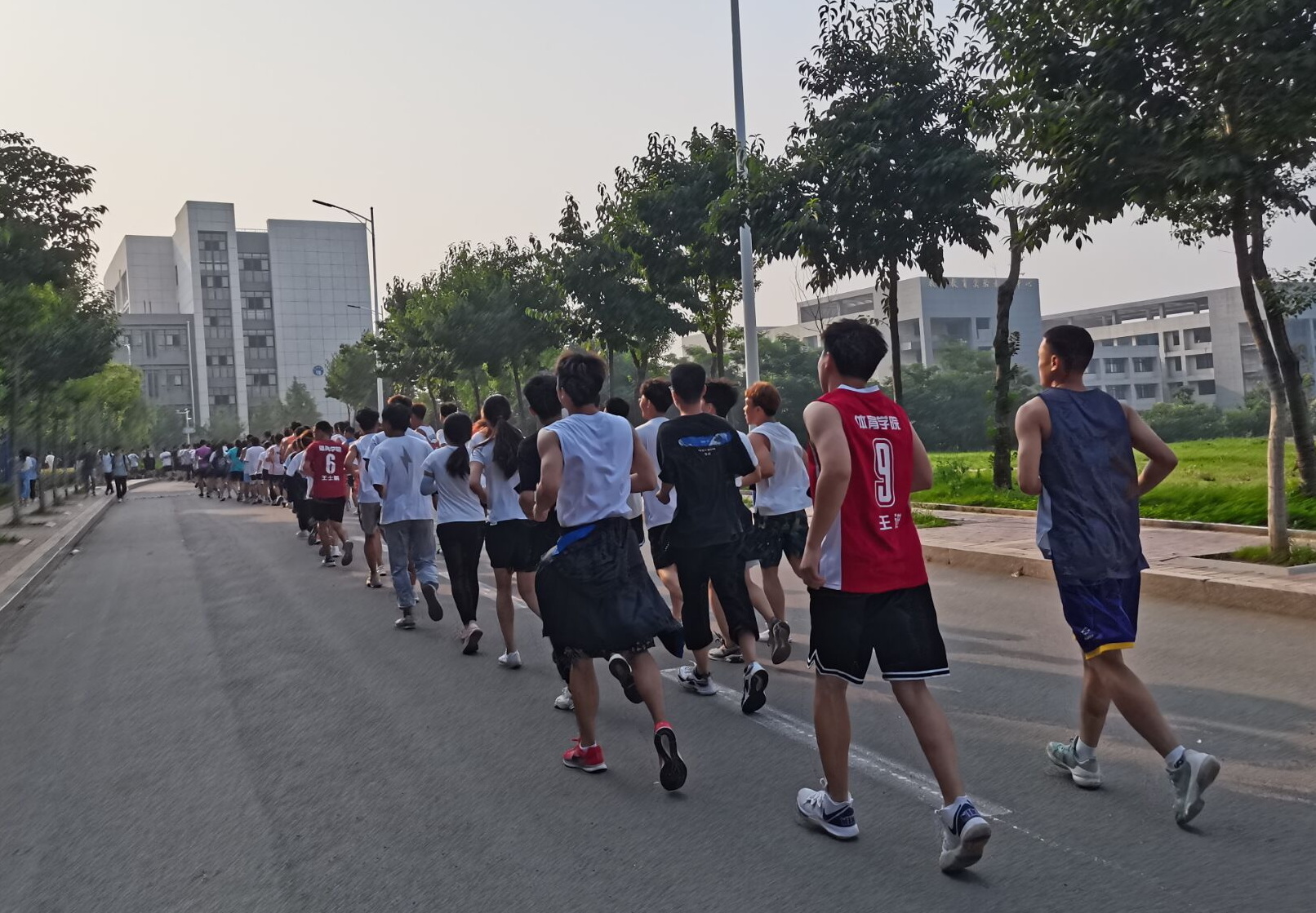 同学们从小广场出发,按照最大环校路线,分别经过田径场、校门口、体院馆、宿舍楼下等大家最熟悉的地方。向着熟悉的校园道一声告别,向着亲爱的母校说一声再见,跑操过程中,口号响彻整个校园,大家在学校门口合影留念,最后回到小广场进行告别活动。