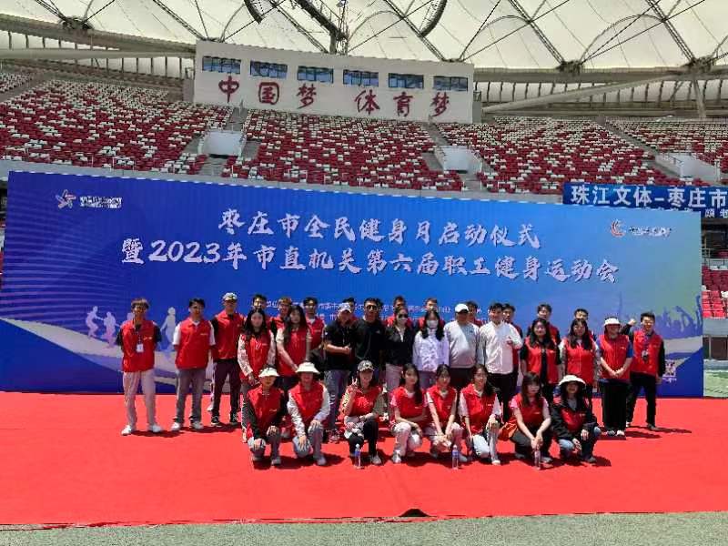为全面深入学习贯彻习近平新时代中国特色社会主义思想,坚持联系实际、立足岗位,实施全民健身国家战略,5月11-12日,2007so太阳集团开展主题教育特色活动,学院党总支统战委员、副院长李丽和组织委员刘志国老师分别作为广播体操和趣味运动会项目的裁判长,带领部分党员师生到枣庄文体中心体育场参加“枣庄市全民健身月启动仪式暨2023年市直机关第六届职工健身运动会”的裁判工作。
