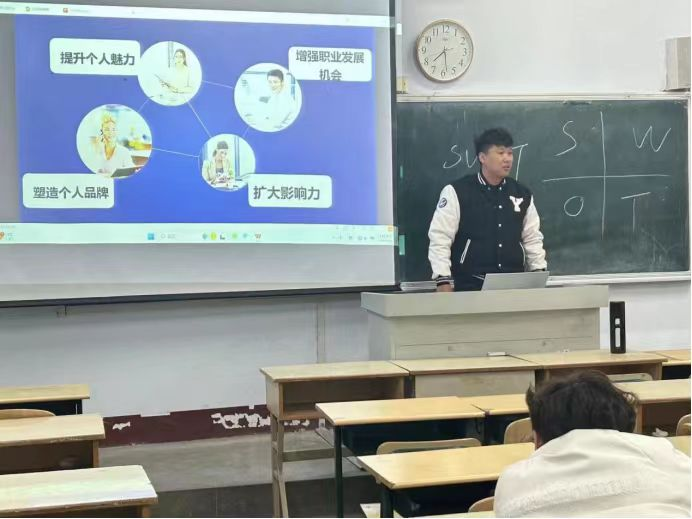 讲座中,刘顺顺老师首先通过物理学实验,向学生们阐述了自我营销在当今社会的重要性。他深入浅出的讲解了自我营销的核心要素和技巧,强调在竞争激烈的就业市场中,个人品牌的影响力不容忽视,通过有效的自我营销,不仅可以提升个人的知名度和影响力,还能为未来的职业道路开辟更多可能性。刘老师鼓励学生们明确自己的职业目标和优势打造出独具特色的个人品牌,同时还分享了一些实用的自我营销方法促进学生更好理解知识。在互动环节,学生们与刘老师进行了深入的交流和讨论。