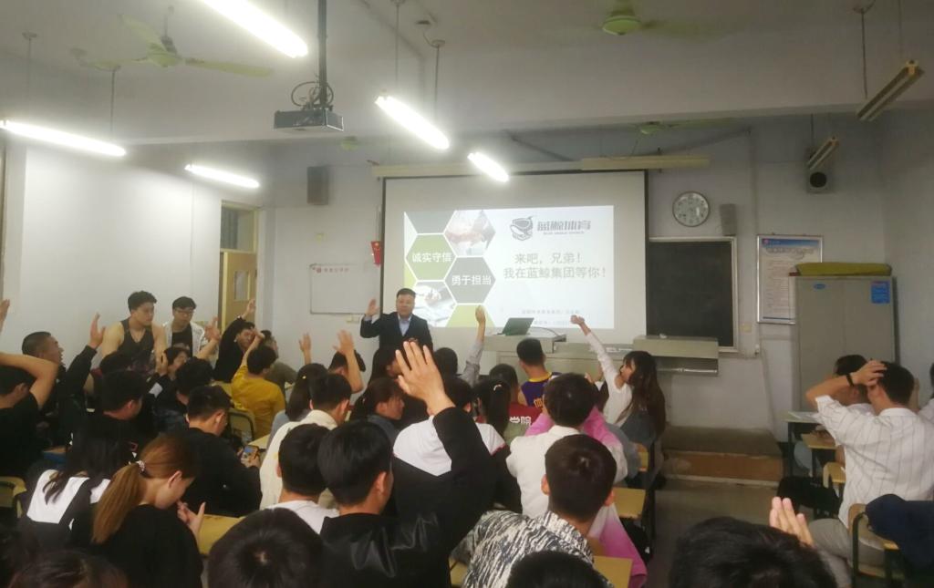 前来进行招聘宣讲的蓝鲸体育的冯经理介绍到,蓝鲸体育是目前中国领先的体育培训服务提供商之一,拥有资深的管理团队和专业的教学研发团队,至今已为学员提供了近万次专业的体育项目培训服务。蓝鲸体育目前以体育培训为主要业务核心,开设有篮球培训羽毛球培训以及青少年体能培训等项目,陆续会在体育赛事、体育场馆、体育科技、体育营地等领域延展,形成以多类目体育培训为中心的相关多元化体育产业集团。