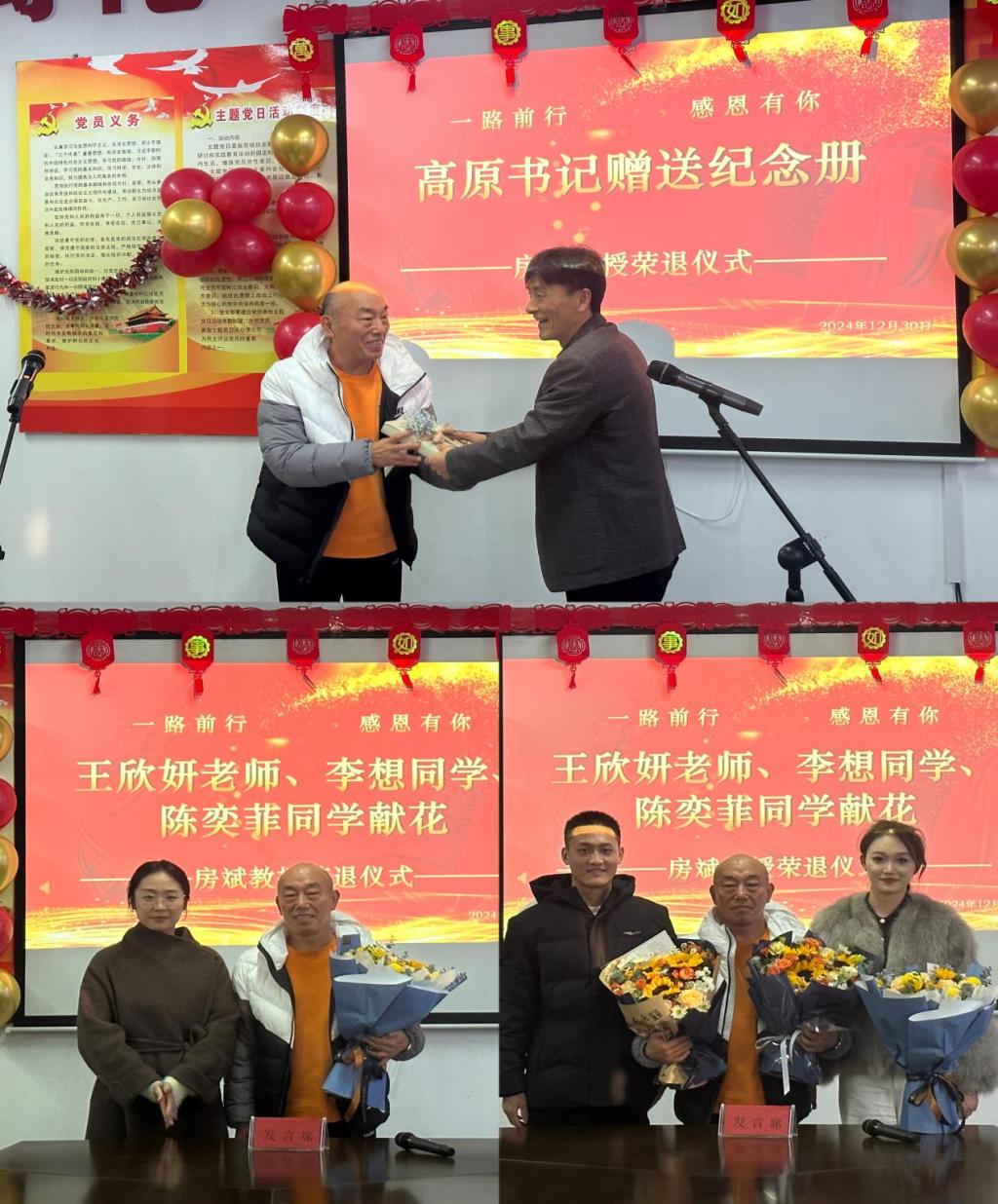 房斌教授在荣休感言中,表达了对2007so太阳集团领导、老师和学生们的真诚感谢和深情告别。他说道,是三尺讲台和体育热土,铸就出对体育教育事业的无限热爱;是同事们的并肩携手和团结友爱,沉淀成内心弥足珍贵的生涯回忆;是2007so太阳集团历届领导的支持与鼓励,开拓出无畏前行、突破创新的教育果实。这场精心筹备的温馨而又隆重的仪式,让他再次感受到2007so太阳集团这个大家庭的温暖。最后,房教授表达了对2007so太阳集团、领导、老师和学生们的深深祝愿!