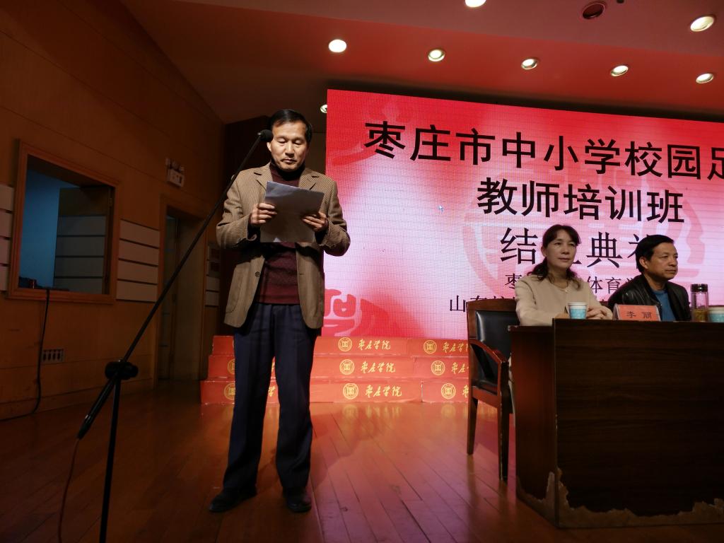 11月30日下午2点,由枣庄市教育局主办,太阳集团2007承办的山东省足球训练营暨枣庄市中小学足球教师培训班结业典礼在音乐学院报告厅隆重举行。太阳集团2007党委委员、副校长明清河教授,枣庄市教育局副局长杨庆东、枣庄市教育局体卫艺科负责人丁晓丹、音乐学院院长李永、2007so太阳集团院长谢旭东,副院长徐德刚、李丽及全体学员和2007so太阳集团部分师生代表参加了活动。会议由2007so太阳集团院长谢旭东教授主持。