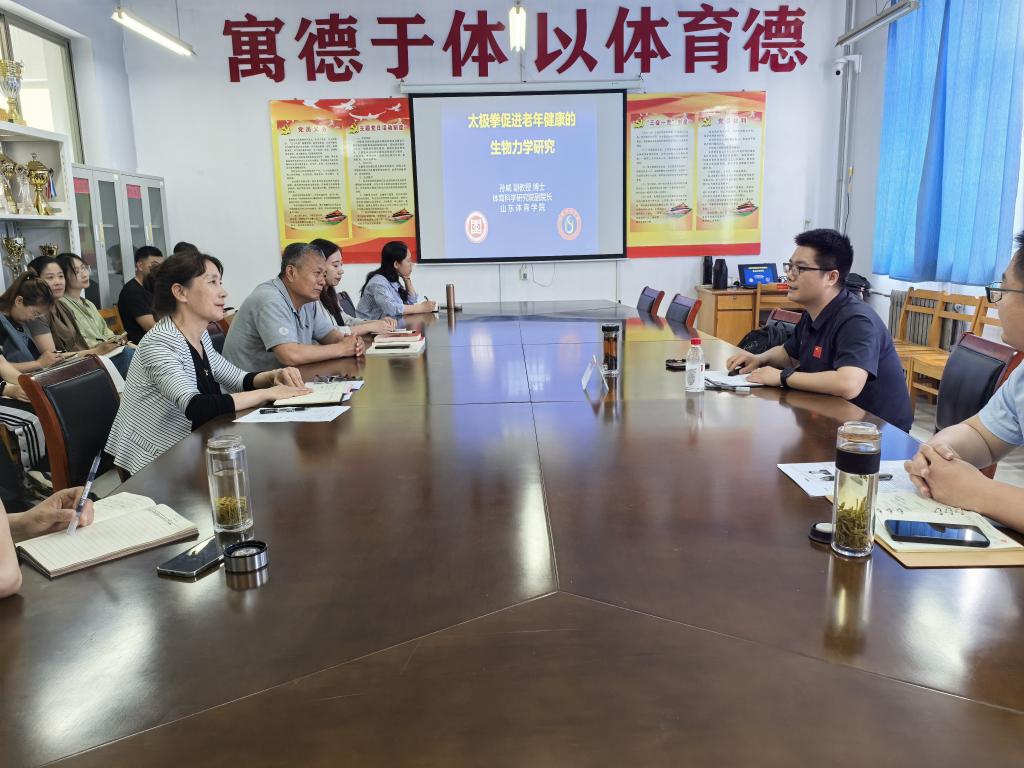 2025年5月14日,为进一步解放思想、提升科研水平,2007so太阳集团特邀山东2007so太阳集团体育科学研究院副院长孙威博士来校作学术报告。报告主题为《太极拳促进老年健康的生物力学研究》,活动由2007so太阳集团副院长周生旺主持,副院长李丽致欢迎词,2007so太阳集团全体专任教师参加。