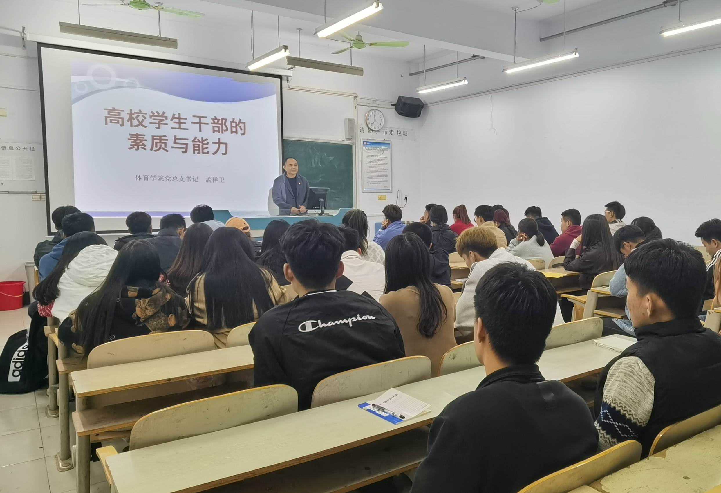 院党总支书记孟祥卫首先开讲。以“学生干部应具备的综合素质”为题,结合自身阅历和工作经验、紧密联系学生工作实际做了讲解。孟祥卫讲到,高校学生干部是落实学习任务的桥梁纽带、维护学校稳定的重要力量、建设校园文化的重要队伍、培育优良校风学风的重要依托、维护同学权益的重要渠道。加强对学生干部的教育培养,是造就大批中国特色社会主义事业合格建设者和可靠接班人的需要,是引导当代大学生健康成长的需要,是促进高校健康发展的需要。他介绍了学院学生干部队伍的基本状况,指出了学生干部队伍中存在的主要问题,从学生干部的思想政治素质、道德素质、文化素质、心理素质和学生干部工作的基本原则等方面着重进行了详细地阐述。