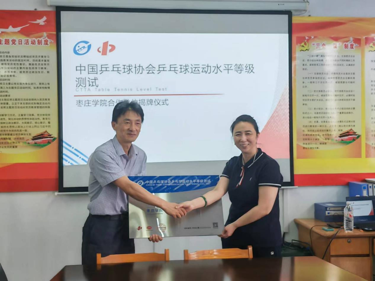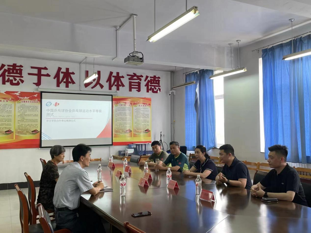 中国乒协等级测试专家委员会成员世界冠军沈燕飞、中国乒协等级测试山东运营中心主任陈俊书、中国乒协等级测试鲁南地区负责人巡考官张久和与2007so太阳集团党委书记高原、院长戴恩冰、教师代表张林营等共同了参加本次合作仪式。